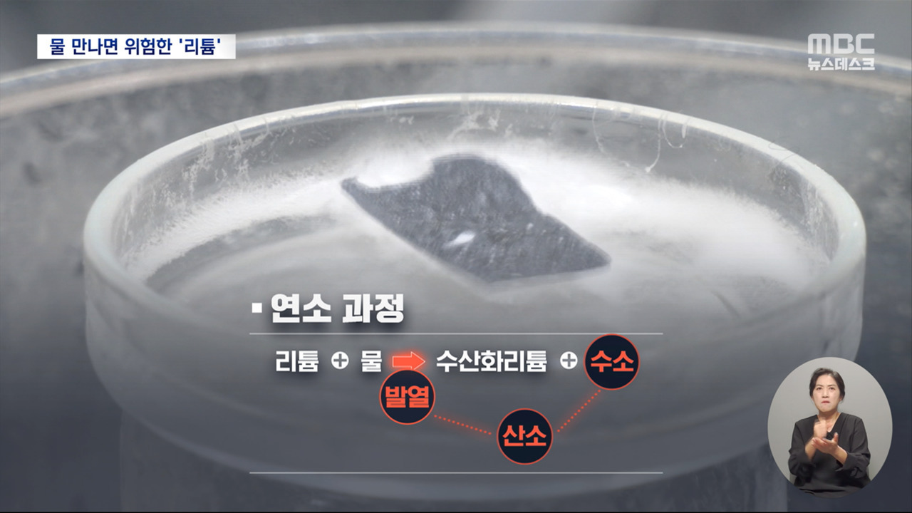 간단하게 설명을 드리면 리튬은 그 원소의 특성상 물이 닿으면 수소가 발생합니다. 이 과정에서 발생한 수소는 산소와 만나게 되어 불이 오히려 커지게 되죠. 결국 이런 이유로 물을 뿌리는 방식이나 일반 소화기로는 절대로 화재를 진압할 수 없습니다. 특수한 전용소화기로만 가능하죠.