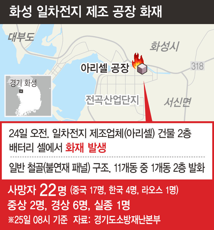 이번에 사고가 난 공장은 리튬으로 된 1차 전지를 다루는 곳이었습니다. 1차 전지는 충전을 하지 않고 한 번 쓰고 버리는 전지이며 2차 전지는 충전이 가능합니다. 문제는 이렇게 리튬이 포함된 전지는 불이 났을 때 물로는 절대 끌 수 없다는 점입니다.