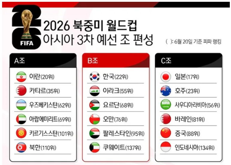 2022년 카타르 대회까지는 아시아에 4.5장의 쿼터가 배분되었는데 이번에는 8.5장이나 되어 조 2위만 되어도 자동 진출, 3위가 되어도 출전 가능성이 높은 상황입니다.