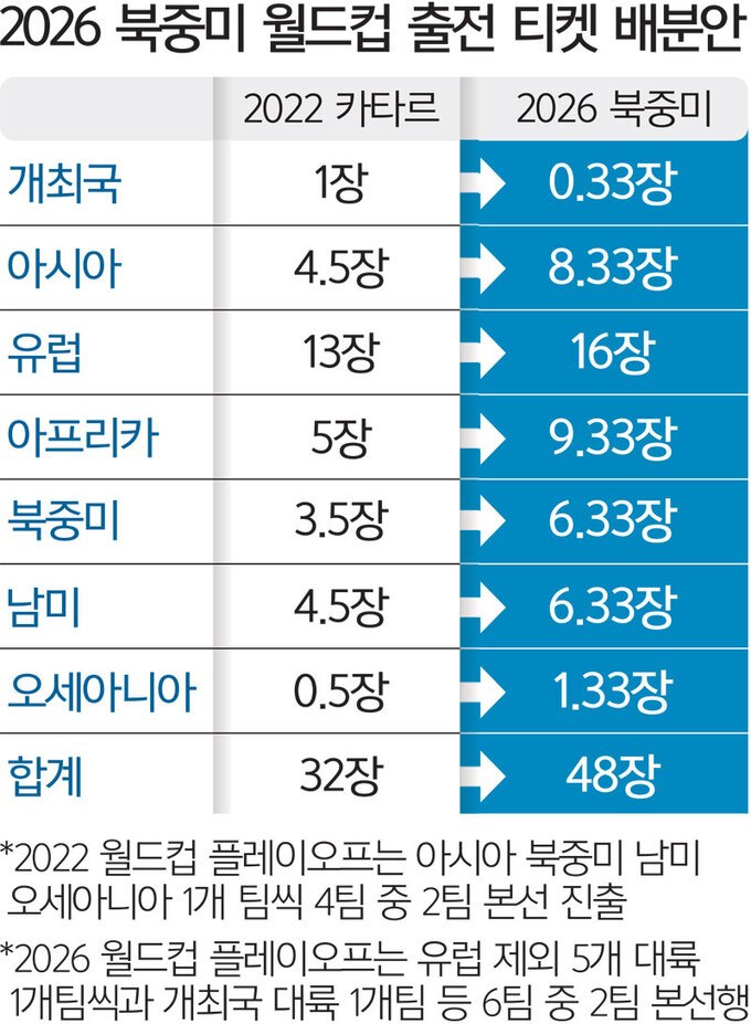 왜냐하면 2026 북중미 월드컵에서는 기존의 32개국이 아닌 48개국이나 출전하는 방식으로 변경되었기 때문입니다. 2017년 1월 국제축구연맹(FIFA) 위원 37명으로 구성된 평의회에서 만장일치로 본선을 48개국으로 늘리기로 결정했죠.