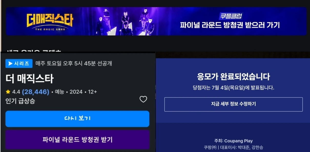 이제 이 프로그램은 중반을 지나 점점 마지막 결승점을 향해서 달려가고 있습니다. 지난 회차에서는 이 경연을 파이널 라운드 방청권을 추첨한다고 하는 공지가 나와서 사이트로 달려갔습니다. 경쟁률이 높아 당첨 가능성이 높지는 않지만 반신반의하며 신청을 했습니다. 오히려 1인당 두 장만 준다고 해서 당첨되었을 때 아이들에게 양도할 수 있는지 그게 안 된다면 누구를 데려가야 할지가 더 고민해야 할까 봐 걱정이죠