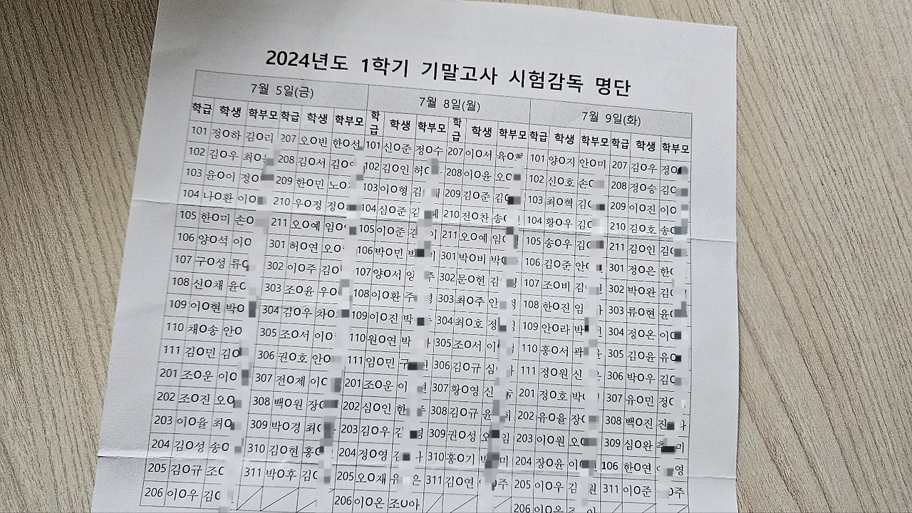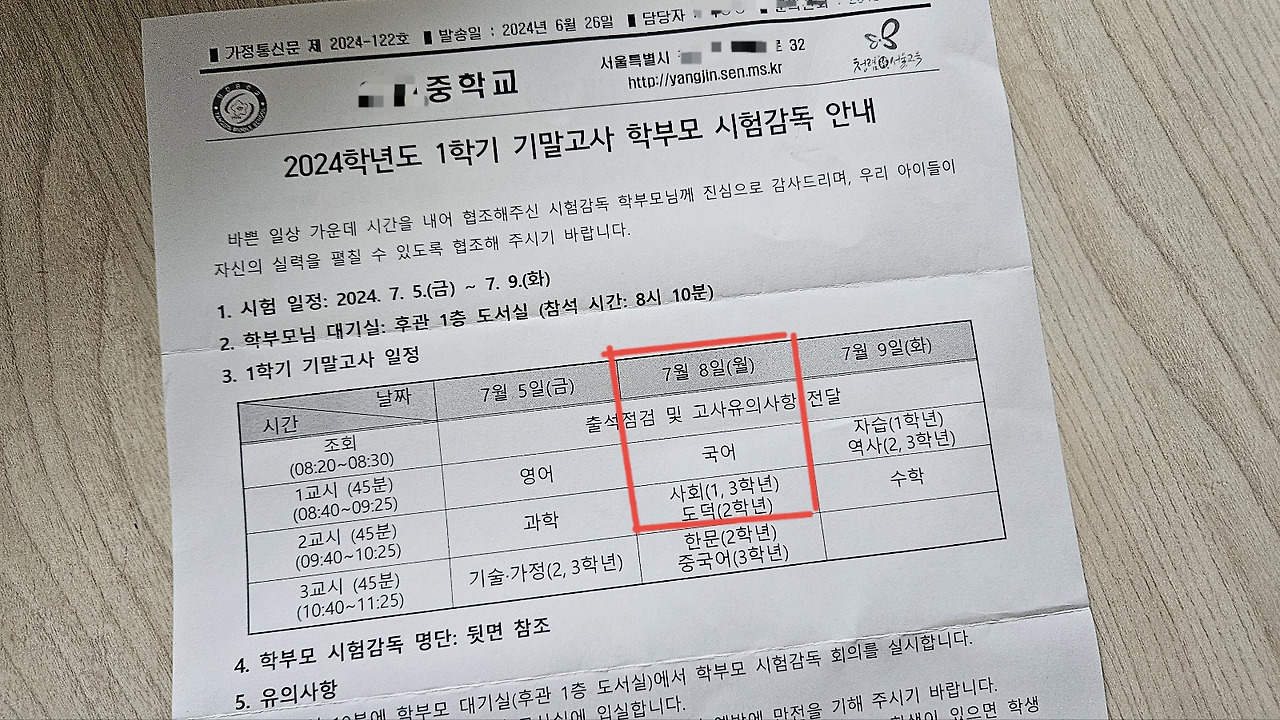 그렇게 그날의 기억을 잊고 있던 어느 날 건강이가 학교에서 받은 봉투를 제게 갖다 줍니다. 열어봤더니 바로 기말고사 감독 일정에 대한 안내문이었습니다. 생각보다 많은 부모님들이 참여하신다는 사실을 알게 되었습니다.