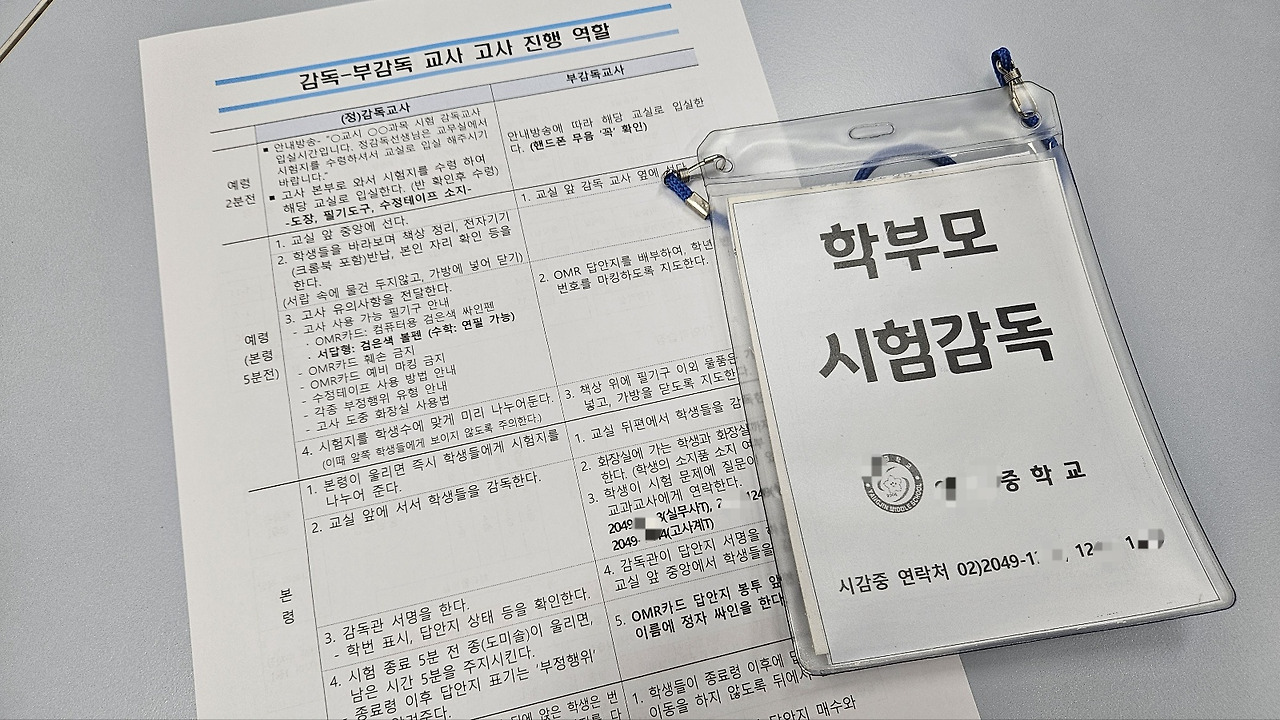 그런데 이번에는 아이들이 겪는 마음을 공감해 주기 위해 새로운 방식을 추가로 선택했습니다. 바로 시험감독, 일명 시감 신청이었습니다. 학부모들을 대상으로 보조 감독 지원을 받는 제도인데 하루에 각 반에 한 명씩 해서 총 3명을 지원받습니다.