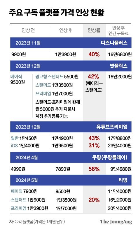 이미 유튜브를 비롯해 넷플릭스, 디즈니 플러스, 티빙 같은 OTT 사업자들이 요금을 앞다투어 2~4천 원씩 올렸기 때문이죠.
