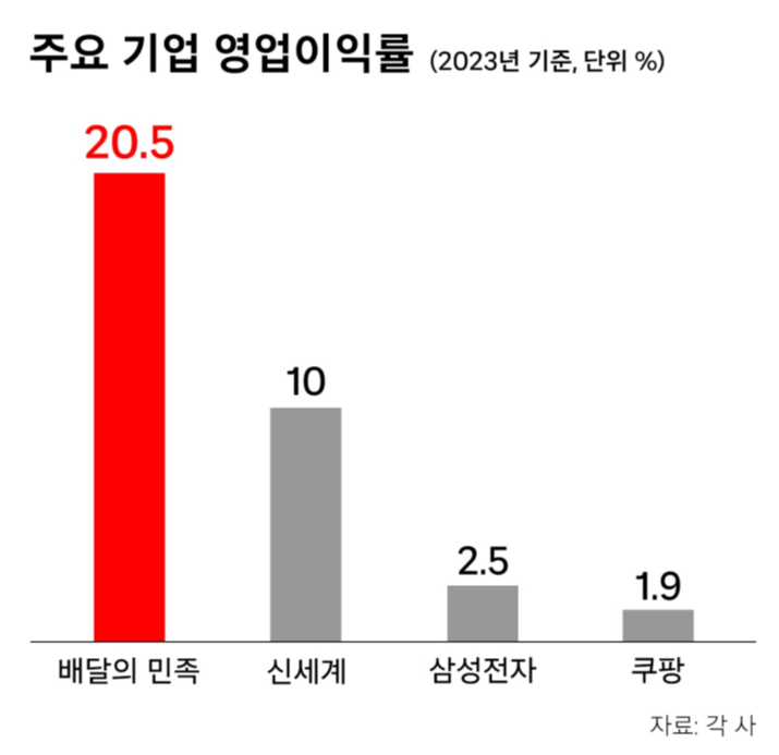 얼마 전 배달의민족이 2023년에 매출 3조 4155억 원, 영업이익 7천억에 달한다는 뉴스가 있었습니다. 거기에 독일 모기업인 딜리버리 히어로에게는 4천억이나 배당해서 화제가 되었죠. 보통 우리나라 기업들의 영업이익은 제약사 정도를 제외하고는 10%도 높은 편입니다. 현대자동차도 이익률 10%를 넘기고 글로벌 자동차 업체에서 영업이익률 2위를 차지했을 정도니까요.