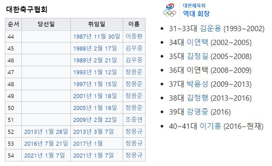 벤투 감독의 재계약 실패 → 무능하고 한국에 머무르지도 않았던 무(無) 전술 클린스만 선임 → 대표팀 장악 실패로 인한 이강인 사태 및 아시안컵 4강 탈락 → 클린스만 위약금 지급 → 40년 만의 축구대표팀 올림픽 진출 실패 → 몇 개월 동안 외국인 감독 뽑는다고 해놓고 홍명보를 감독으로 면접도 없이 선임