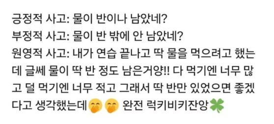 긍정적인 사고방식이 중요하다는 사실을 모르는 사람은 거의 없습니다. 문제는 쉽게 실천하기 어려운 사고방식이기 점이죠. 하지만 인간은 노력에 따라 얼마든지 발전할 수 있는 존재며 습관 또한 충분히 만들 수 있다는 점에서 이런 유행은 참 바람직하다는 생각이 듭니다.