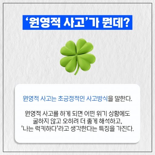 이 표현은 장원영의 이름을 붙여서 원영적 사고라는 말로도 불립니다. 내게 좋지 않은 일이 생겼지만 "오히려 더 좋아"라고 생각하죠. 참 멋진 생각처럼 보였습니다.
