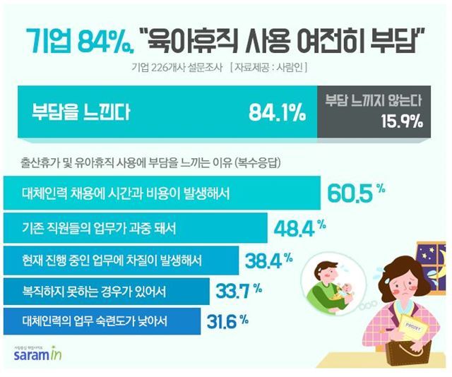 이런 문제는 당연히 나라에서 책임을 져줘야 합니다. 단순히 다른 나라처럼 사업주를 처벌하는 데만 그치지 않고 휴직자의 비율이 높은 회사일수록 더 많은 이득을 줘야 합니다. 법인세 인하와 같은 방식으로 말이죠. 함께 근무하는 직원에게 업무적인 부담이 간다면 그 대가도 불만이 생기지 않도록 합리적으로 지불하는 방식도 마련되어야 합니다.