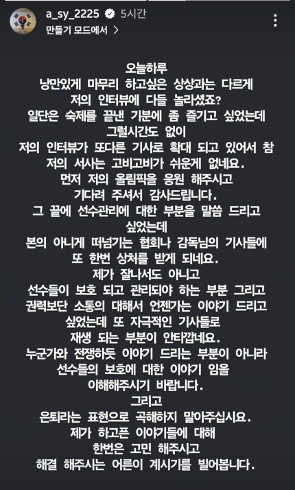 "제 부상은 생각보다 심각했고, 너무 안일하게 생각한 대표팀한테 많이 실망했다. 이 순간을 끝으로 대표팀하고는 계속 가기 힘들지 않을까 하는 생각도 들었다. 이야기를 잘해봐야겠지만 많은 실망을 했다. 나중에 자세하게 또 설명하는 날이 왔으면 좋겠다"라고 말이죠.