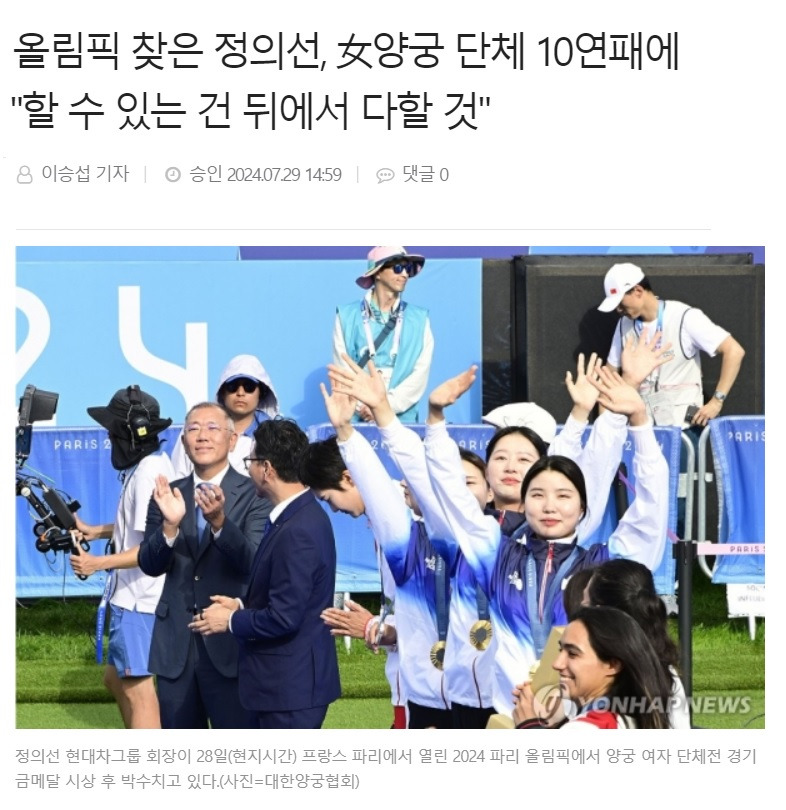 그런 반면에 이번 올림픽에서만 다섯 개의 금메달을 모두 석권한 대한양궁협회의 정의선 회장의 행보는 앞에서 언급한 협회들과 대조가 됩니다. 개인용 슈팅 로봇 개발을 비롯해 선수들을 위한 전폭적인 지원은 물론 자신이 앞에 나서지 않고 선수들에게 공을 돌리는 겸손함은 당연한 덕목이라고 할 수 있음에도 눈길을 끌 수밖에 없습니다.