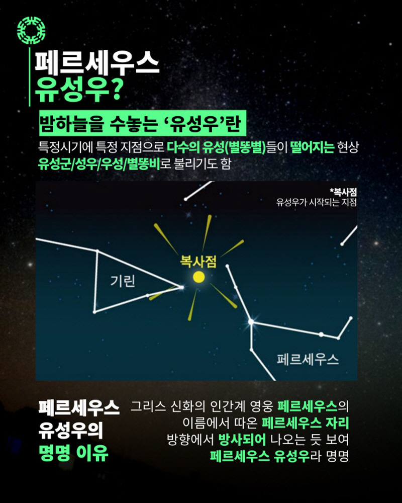 어젯밤에는 페르세우스 유성우로 전국이 떠들썩했습니다. 밤까지 이어지는 폭염으로 인해 잠 못 드는 밤에 별똥별들이 밤하늘에 수를 놓으며 장관을 연출했죠. 북동쪽 페르세우스자리 방향에서 방사돼 나오는 듯 보여 페르세우스 유성우라고 이름이 지어졌다고 합니다.