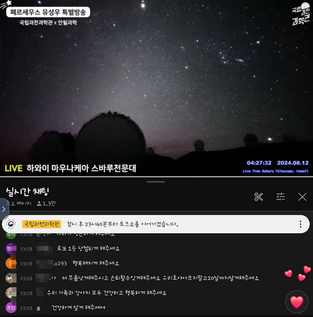 하지만 저도 아이들을 재우고 나니 시간이 늦어서 유튜브 방송으로 조금이라도 별똥별들을 보려고 했습니다. 그런데 방송으로 보이는 화면이 아니라 눈길을 끄는 부분이 있었습니다. 바로 댓글이었는데요.
