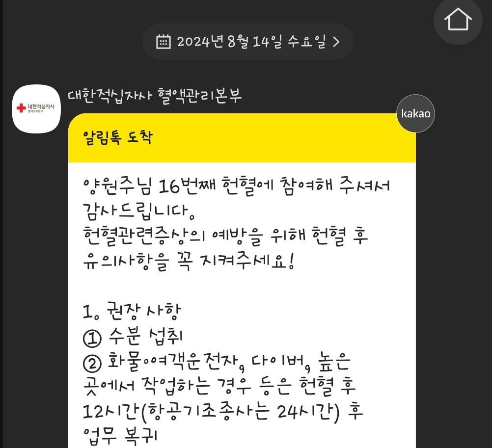 헌혈을 마치고 돌아오는데 알림 메시지가 도착해 있었습니다. 회사에서 헌혈 휴가가 생긴 이후로 웬만하면 꼬박꼬박 한 해 두 번씩은 참여해 왔습니다. 직전 이력을 보니 이번에는 거의 1년 만에 참여했더군요.