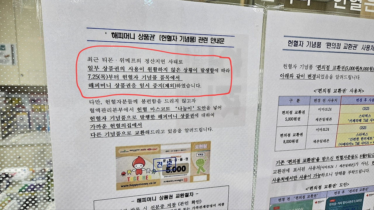 저는 헌혈을 하면 주는 사은품으로 편의점 상품권을 받았습니다. 놀러가서 아이 친구들에게 상품으로 줬는데 꽤 좋아하더군요. 원래는 문화상품권을 주로 줬는데 이번 티몬, 위메프 사태로 지급이 잠정 중지되었다는 공지가 붙어있었습니다. 기업의 도덕적 해이와 무능으로 인해 발생한 사고가 생각보다 훨씬 광범위한 피해를 만들었음을 새삼 여기서도 느낍니다.