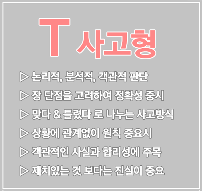 판단영역에서 감정형인 F형과는 달리 T형은 사고형이라는 특징처럼 이성적인 성향이 강하고 상대적으로 공감 능력이 떨어진다고 알려져 있습니다.