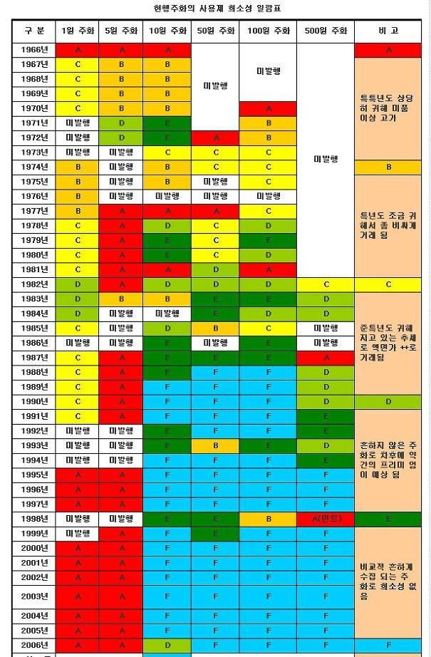이 글을 읽으시는 분들도 혹시 시간이 되신다면 이 표를 보시고 저금통을 털어서 정리 한 번 해보셔요. 혹시 모르잖아요. 액면가보다 훨씬 비싼 동전이 우리 집에 숨어있을지도요. 저희 집은 이미 행복이가 이 표를 보고서 한 번 싹 돌려봤다고 하는데 꽝입니다.