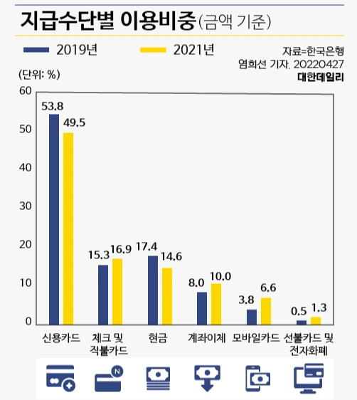 동전은 이제 점점 우리 역사 속으로 사라지고 있는 실정이라 이렇게 보내기가 살짝 아쉽기는 했죠. 아시다시피 이제 온라인 뱅킹이나 신용카드뿐만 아니라 간편 결재로 대부분의 금전거래를 하고 있다고 해도 과언은 아니니까요. 전체 지급수단 중에서 현금을 사용하는 비중은 점점 눈에 띄게 줄어들고 있죠.