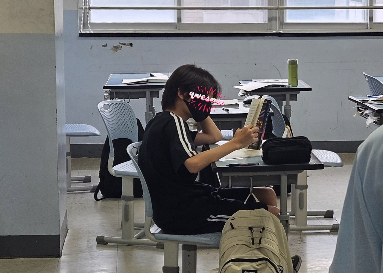 5교시 영어수업을 마친 뒤 쉬는 시간에 조용히 책을 읽는 건강이를 보면서 소소한 기념사진도 하나 남깁니다. 6교시는 영어와는 다르게 미리 준비한 각자의 자료들을 발표하는 시간이 있었습니다. 각자 조사한 매체에 대해서 장점과 단점, 독특한 점을 알아본 뒤 작성하고 발표하는 시간이었죠. 행복이는 '아기공룡 둘리'를 고르고 건강이는 '티쳐스'로 정해서 발표했습니다.