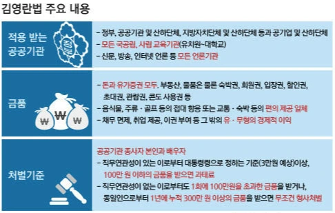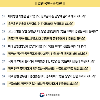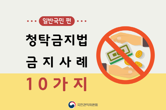 학교 선생님은 학생들에게 스승의 날에 감사편지 한 장을 받을 때도 봉투에 들어있으면 꺼내서 달라고 할 정도로 민감하게 반응하십니다. 불필요한 오해를 받고 싶지 않아서죠. 예전에 봤던 청탁금지법 위반 사례 중에는 직원이 협력업체 직원과 6천 원짜리 칼국수를 먹었는데 해임이 된 적도 있었습니다.