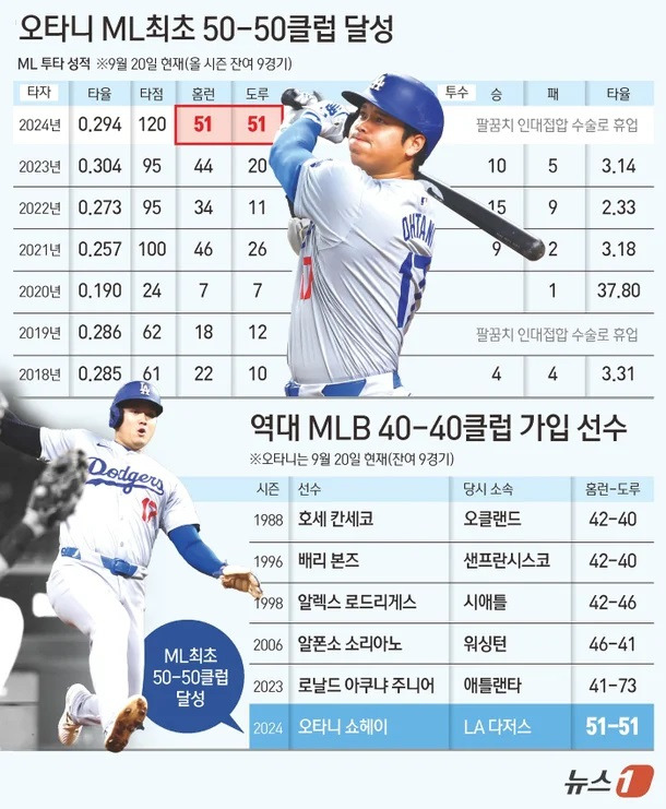 오늘 메이저리그에서 위대한 사건이 하나 일어났습니다. 바로 메이저리그 야구선수인 오타니 쇼헤이가 50-50 클럽을 달성해서였죠. 50-50 클럽이란 홈런 50개, 도루 50개 달성을 뜻하는 표현인데요. 이 데이터가 정말 대단한 이유는 123년의 메이저리그 역사상 최초로 이뤄낸 기록이기 때문입니다.