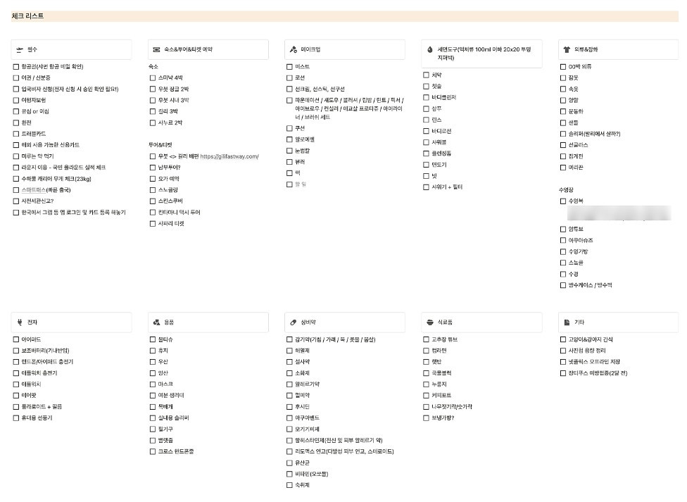 짧은 일정이지만 발리까지 4인 가족이 이동하다 보니 챙겨야 할 짐들이 적지는 않습니다. 체크리스트는 간단하게만 그때그때 작성합니다. 지나치게 계획적인 성격을 바꾸고 싶어서였죠. 사실 예전에 지인들과 오스트리아-체코 자유투어로 다녀온 적이 있었는데 그때는 일정을 제가 주도하면서 5분 단위의 계획표를 짠 적이 있었습니다.