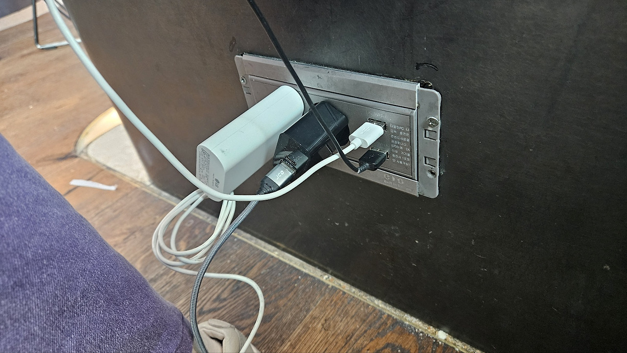 항공사에서 준 밀카드로 푸짐하게 브런치 거리를 산 저희는 자리를 잡고 각자의 할 일을 하기 시작했습니다. 급하게 여기저기 쓰느라 배터리가 빨리 닳아버린 휴대폰에 노트북, 워치까지 충전을 하려고 보니 생각지도 않게 콘센트를 점령한 카공족이 됩니다.