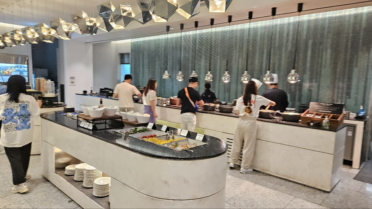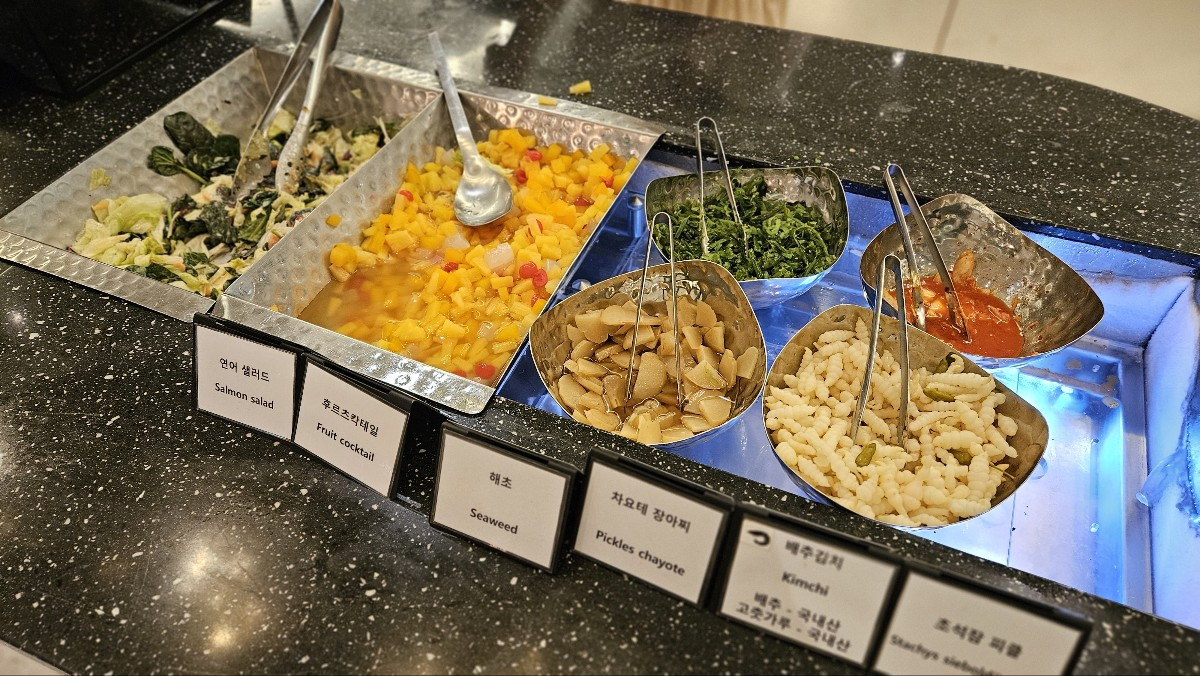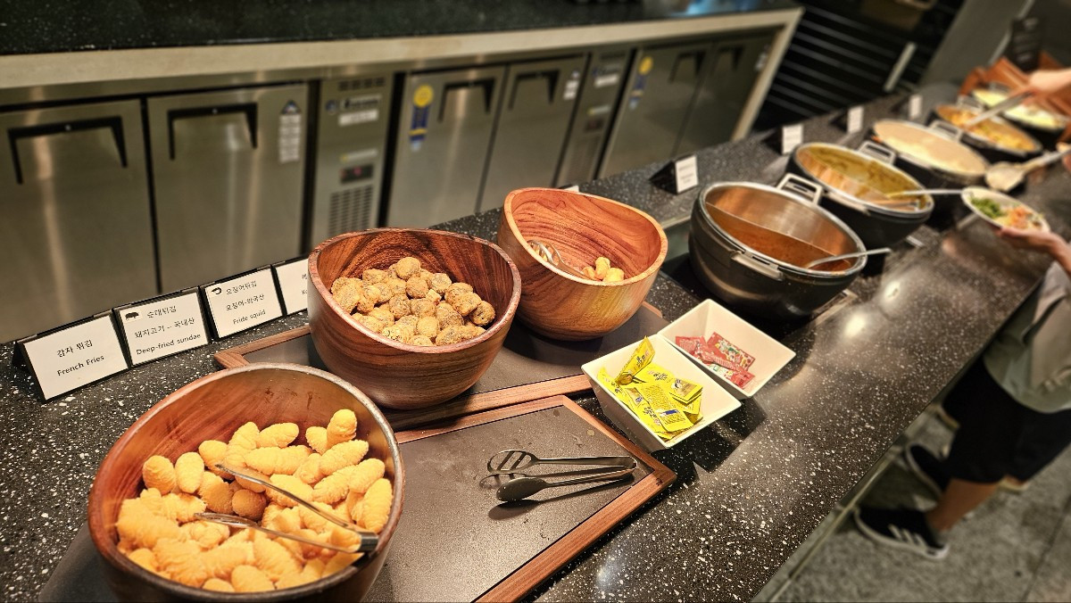 넓은 공간에 자리를 잡고 무슨 음식이 있는지 살펴봅니다. 저녁을 먹은 지 단 두 시간밖에 되지 않았지만 새로운 메뉴들이 많아서 또 부지런히 담아봅니다. 라면까지 제공하길래 여러모로 신기한 곳이다 싶었습니다. 그곳에서도 한 끼 제대로 배를 채워봅니다. 이때부터는 조금 부담스러워지는 느낌이 듭니다.