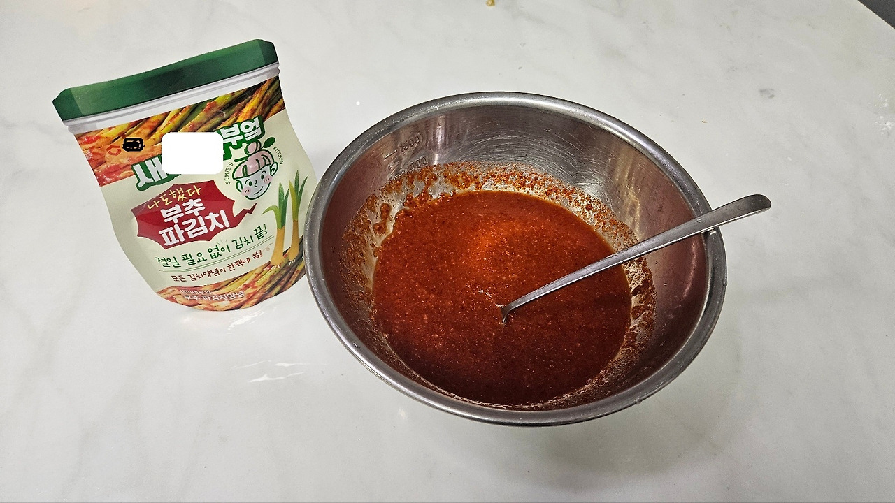 집에 와서 부추를 씻고 열심히 만들기 시작합니다. 그런데 만들다 보니 고춧가루가 정량보다 많이 들어가서 그런지 조금 맵게 느껴졌습니다.