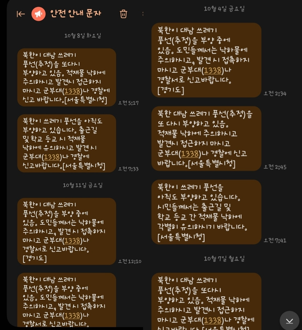 지난주에 저는 다른 이유로 두 번이나 잠에서 깨고 말았는데요. 바로 오물풍선을 경고하는 안전재난문자 때문이었습니다.