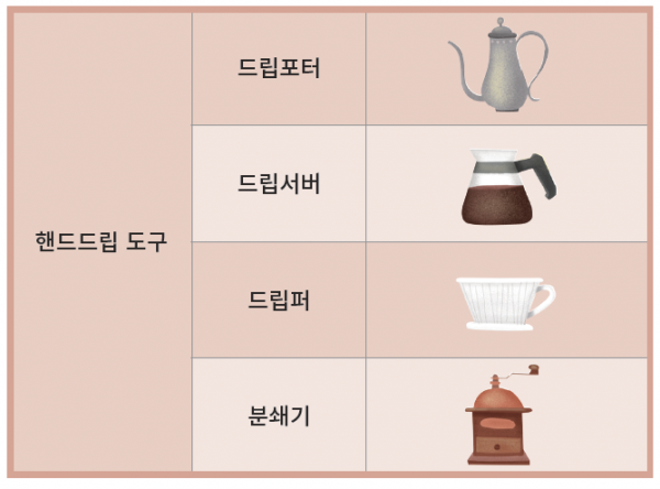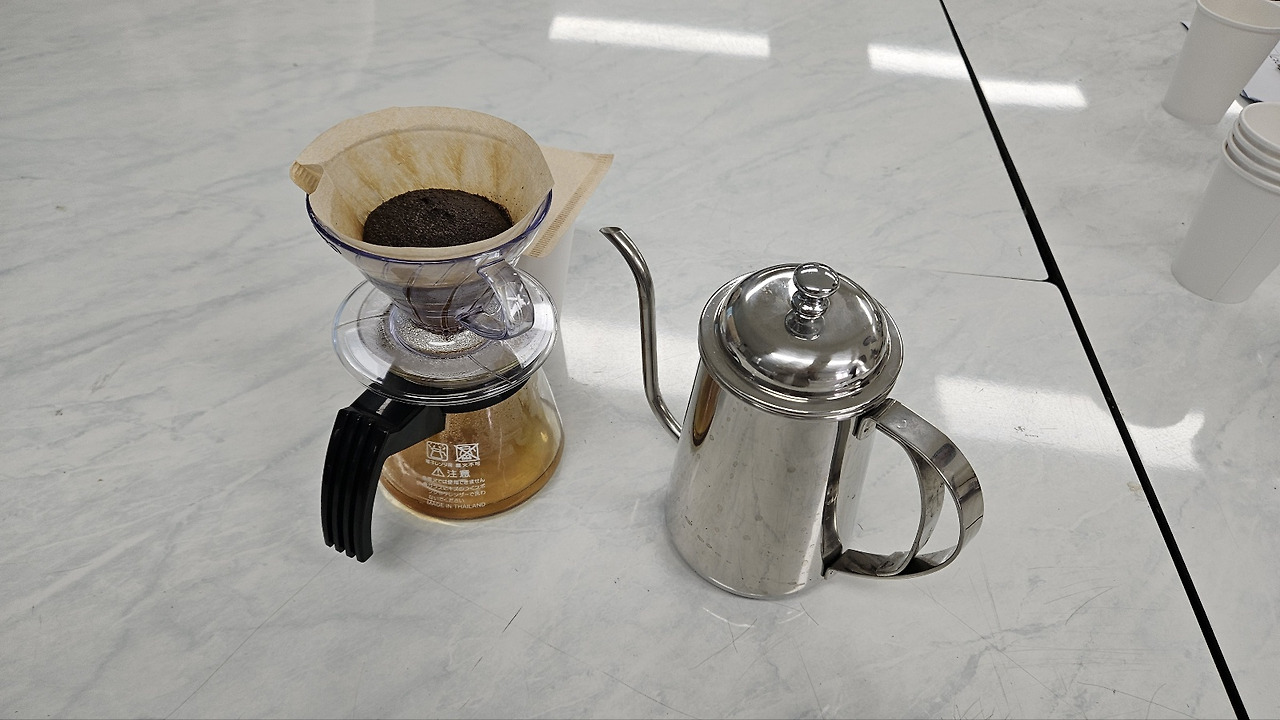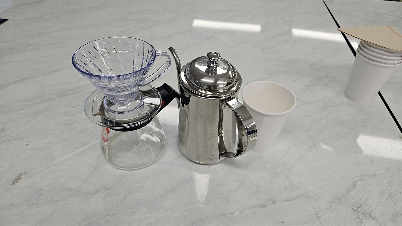 핸드드립 방식으로 추출을 해보기로 합니다. 테이블 별로 드립포터, 드립서버, 드립퍼, 여과지, 종이컵과 같은 도구를 전달받았습니다.