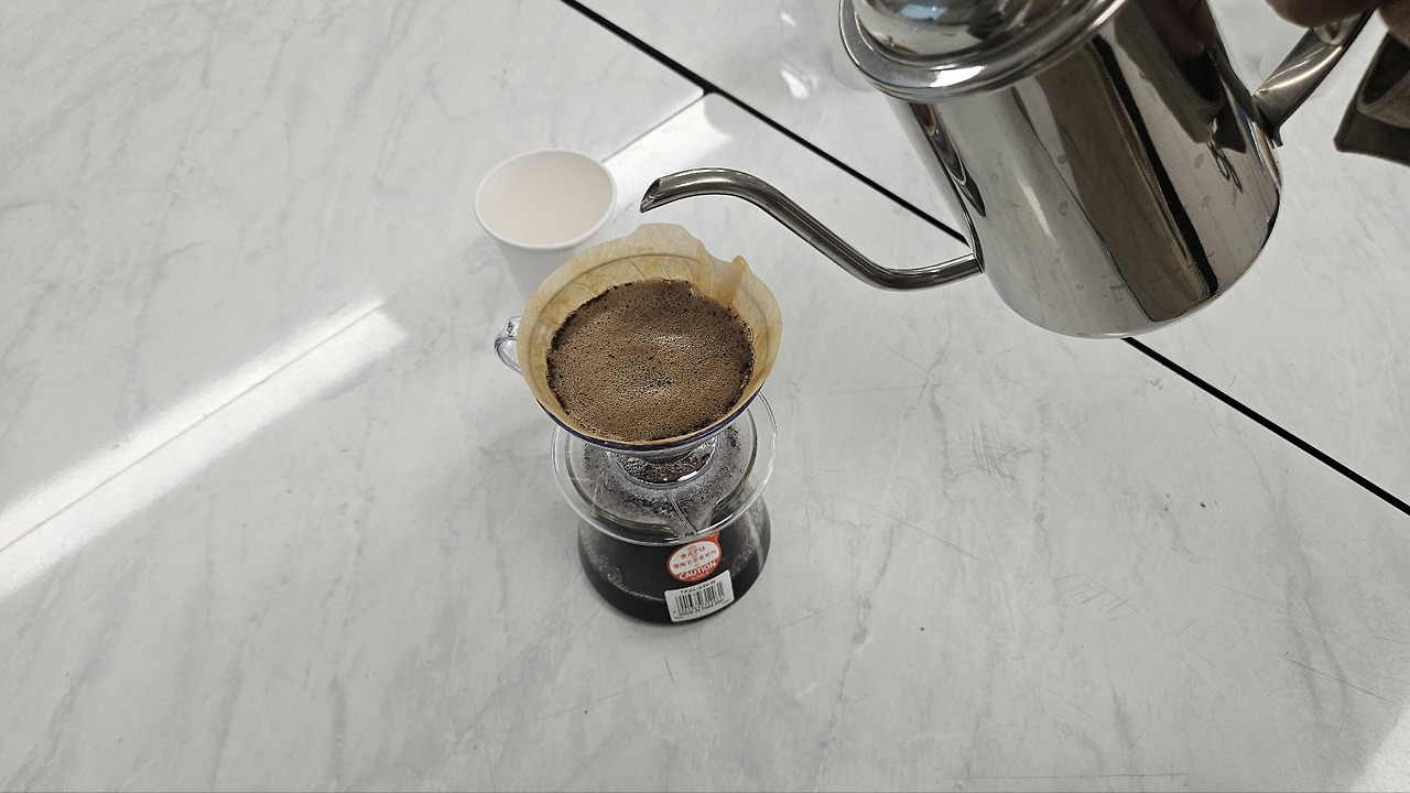 나름대로 이름난 품종이라고 말씀하시더군요. 먼저 소량의 물로 가루를 적셔주는 뜸이라는 작업을 하고 조금 기다렸다가 물을 뱅글뱅글 돌려가면서 붓습니다. 자세한 이론은 바리스타 수업에서 들으실 수 있으니 생략하겠습니다. 강사님의 밥줄은 소중하니까요.