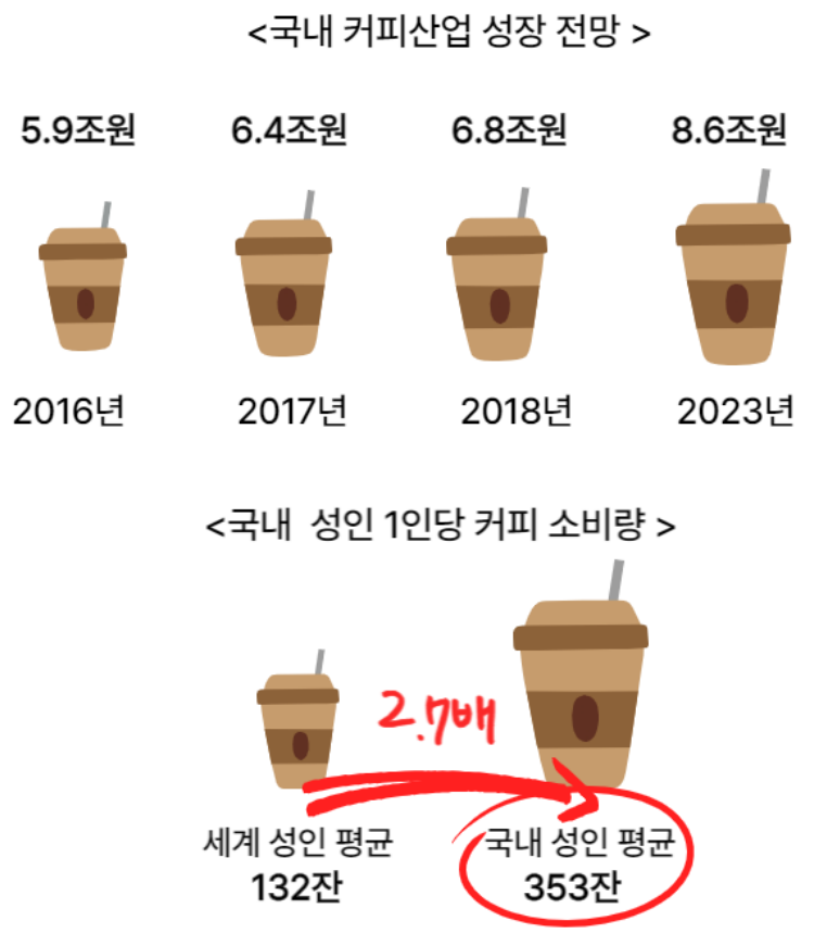 이번 교육 덕분에 여러모로 많은 정보를 얻을 수 있었습니다. 우리나라 커피산업과 커피소비량은 이미 세계 최고 수준을 다툴 정도로 폭발적으로 늘어나있습니다. 이미 포화시장이라고 보이지만 이 산업은 아직까지도 성장하고 있죠.