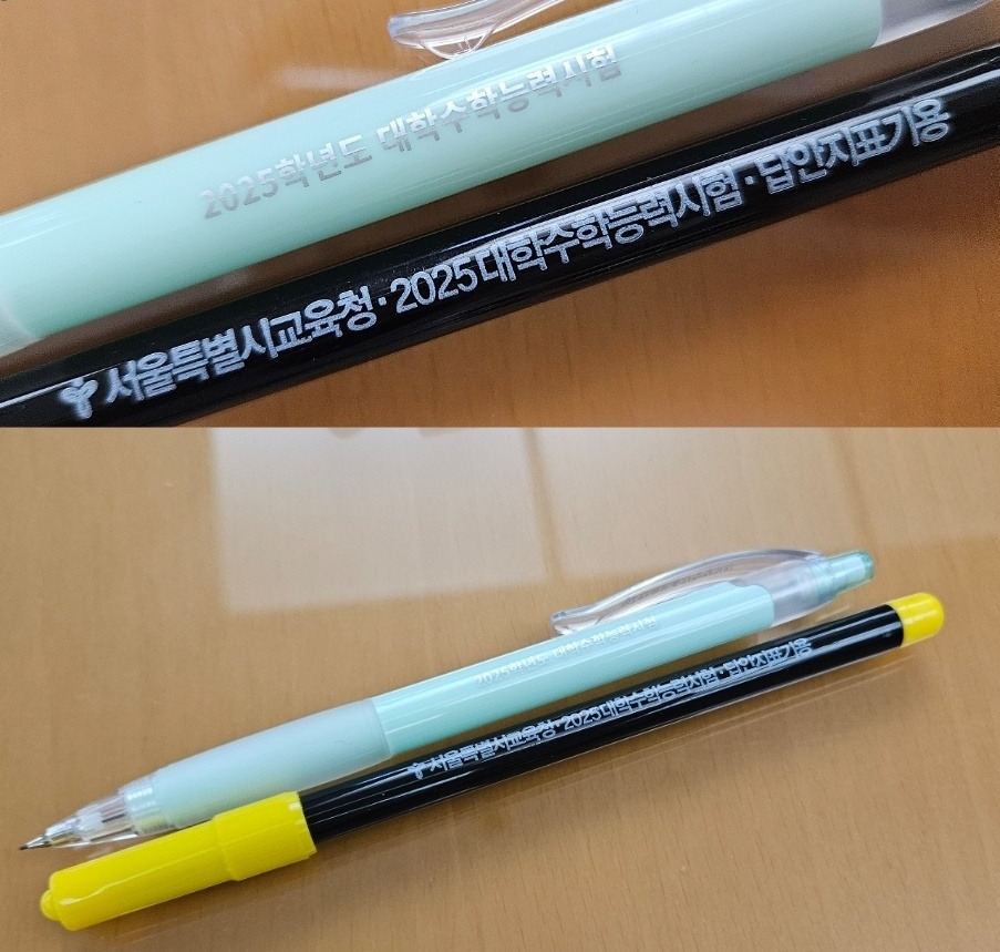 고사본부에서 컴퓨터용 사인펜과 샤프를 그냥 주더라. 다른 필기구는 연필만 가능해. 지우개와 수정테이프는 감독관이 가지고 있지만 따로 챙기는 편이 좋기는 하겠더라. '2025학년도 대학수학능력시험'이라고 적혀있는 문구를 보니 신기하기는 해. 왜냐하면 아빠는 이제 이 샤프와 사인펜을 5번 더 받을 예정이니까. 수능 기념 굿즈 같아서 좋기는 하다.