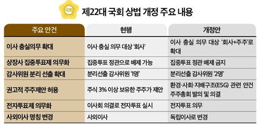 최근 이러한 문제들로 인해 최근 상법 개정이 큰 이슈가 되었습니다. 금융투자소득세 폐지 이후 새롭게 떠오른 뜨거운 감자입니다. 여러 안건에 대한 개선안이 반영된 상법 개정안은 곧 국회 본회의를 앞두고 있습니다. 무난하게 통과될 예정이라고는 하나 정부에서 거부권을 행사하리라 예상되어 앞으로 진통이 예상됩니다.