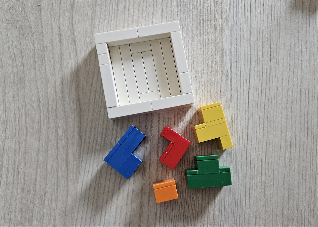 첫 번째는 '컬러 퍼즐'입니다. 정사각형 판 안에 형형색색의 블록들을 모두 채워 넣는 방식입니다.