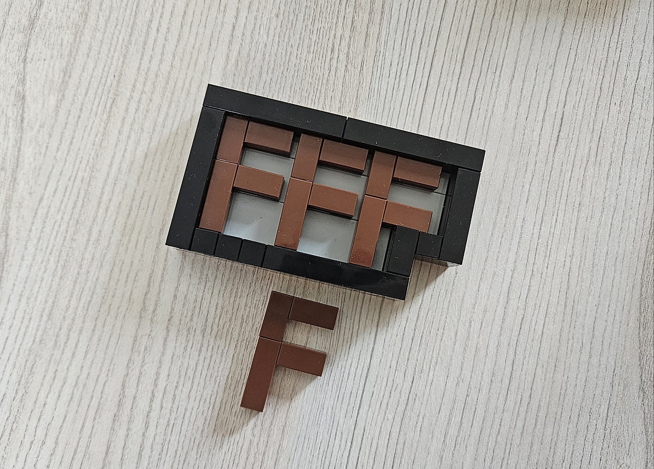 세 개의 F가 들어간 공간 안에 또 하나의 F를 집어넣는 퍼즐입니다. 그림만 봤을 때는 어려워 보입니다. 눈에 보이는 게 다가 아니라는 말이 떠오릅니다. 빈 공간을 계산하면 충분히 새로운 F를 넣을 정도의 면적은 나오니까요.