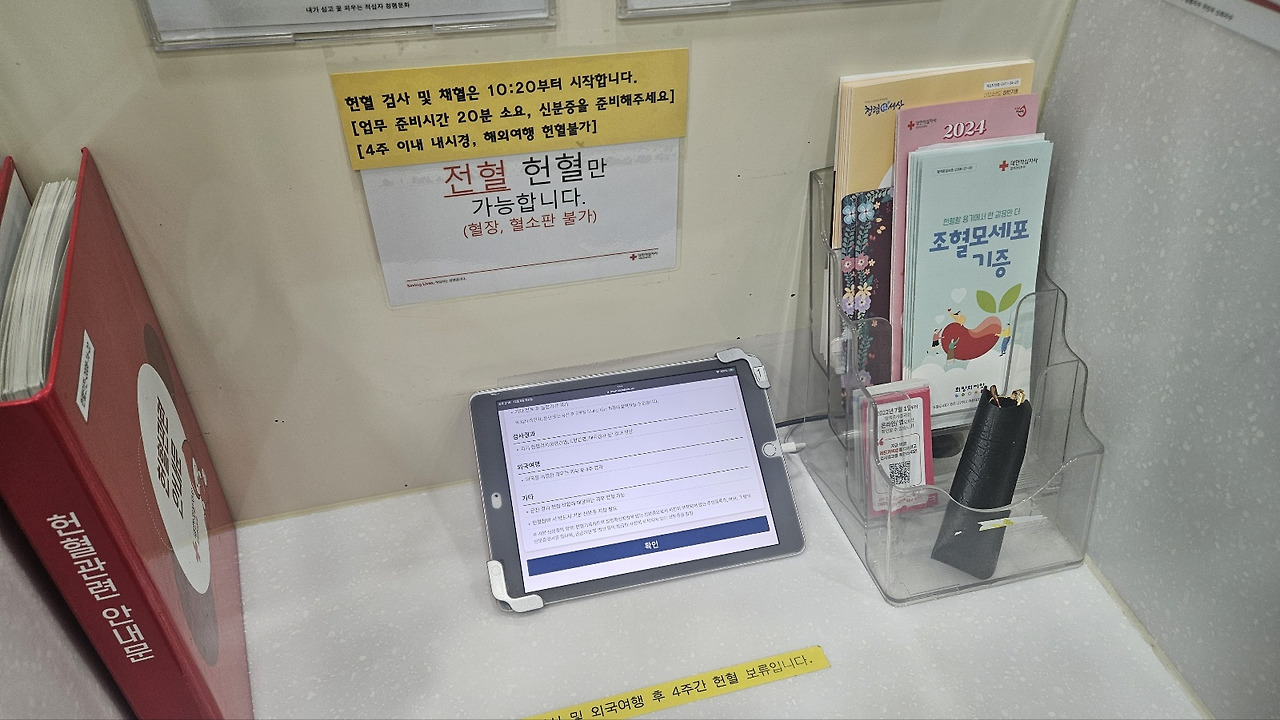 안으로 들어가서 확인한 잠실역센터는 그동안 갔었던 다른 헌혈의집보다 공간이 상당히 좁아서 놀랐습니다. 일단 헌혈을 할 수 있는 의자도 딱 네 개 밖에 없었습니다. 그런 이유에서인지 빨리 채혈이 되는 전혈만 가능하다고 적혀있기도 했죠. 아무래도 공시지가가 가장 비싼 지역이라서 그런 모양입니다.