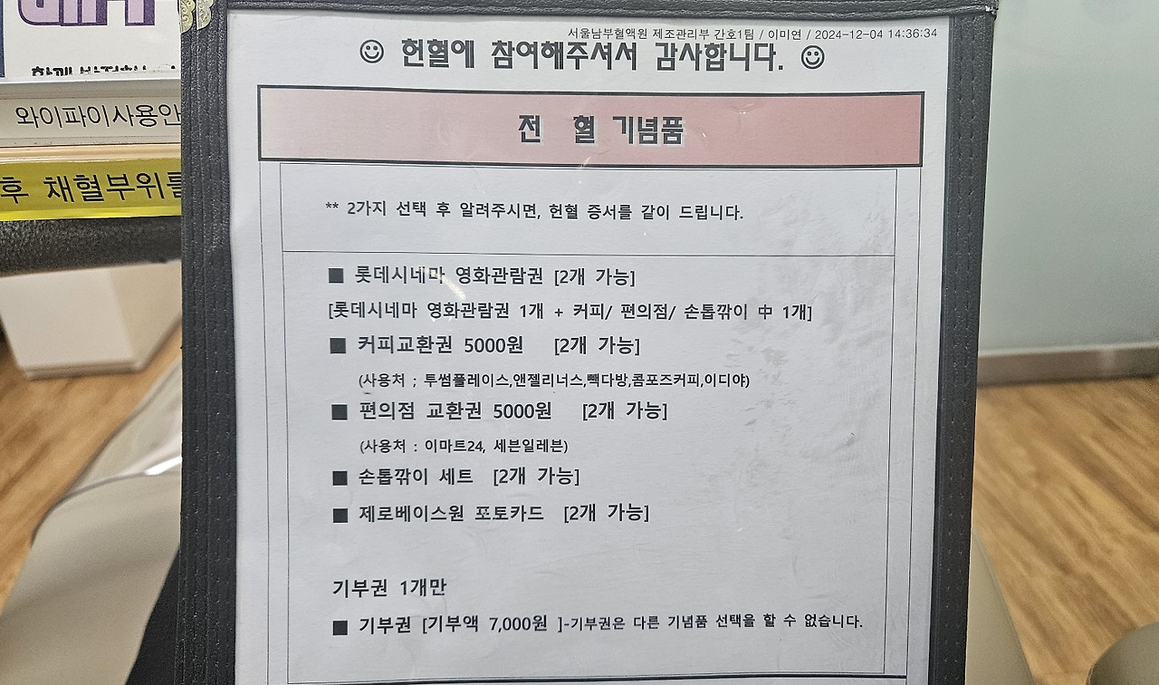 다행인 점은 이번에는 지난번과 달리 주삿바늘이 좀 덜 아팠다는 점이었습니다. 아무래도 사람이 하는 일이라서 그런지 바늘을 꽂는 숙련도의 차이가 있기는 한 모양입니다. 채혈을 하는 동안 잠시 고민을 합니다. 언제나 그렇듯 기념품은 제일 실용성이 높은 커피교환권으로 선택했습니다. 이제까지 기념품으로 대부분 선택되던 해피머니상품권은 티몬 위메프 사건 이후로 완벽히 자취를 감췄더군요.