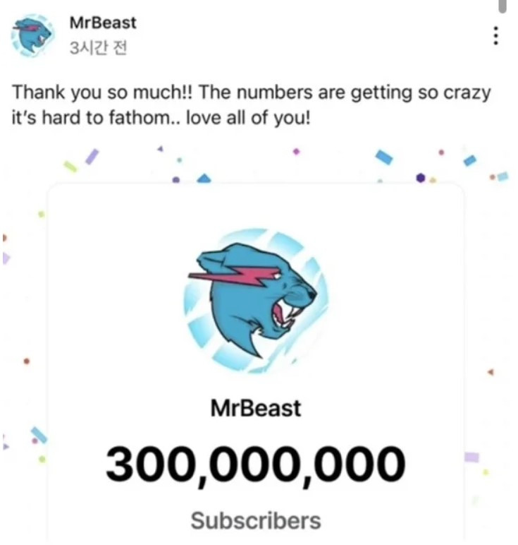 미스터비스트는 미국인이 만든 유튜버 채널인데요. 구독자가 3억 명을 넘어 현재는 3억 4천만 명으로 세계에서 가장 많은 구독자를 보유한 채널입니다.