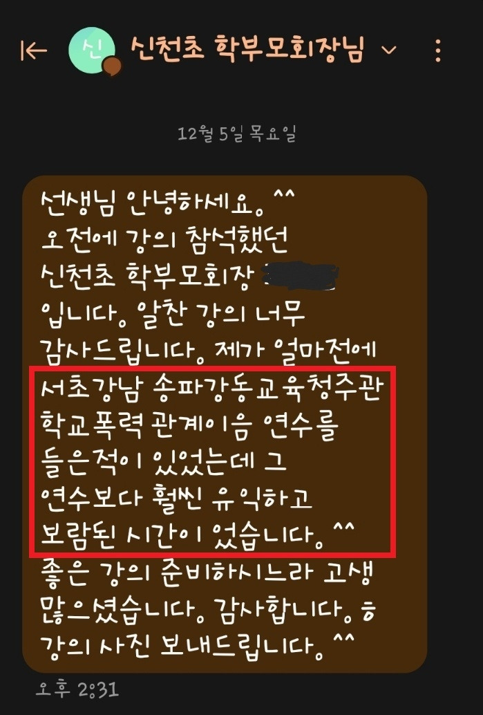 이 교육을 해보니 학부모님들께 실질적인 궁금증을 해결하는 데 도움이 제법 되겠다는 생각이 많이 들었습니다. 학부모회장님께서도 도움을 많이 얻으셨다는 말씀을 해주셔서 힘이 많이 나더군요.