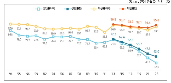 그리고 두 번째 문제점은 종이책의 실종된다는 점입니다. 그나마 학생 때 책을 읽는 편인데 이마저도 사라져 버린다고 하니 큰 문제가 아닐 수 없습니다. 2023년 국민독서실태조사에서 어른의 독서 비율은 더 떨어졌지만 학생들의 종이책 독서 비율은 올라갔습니다. 고무적인 결과입니다.