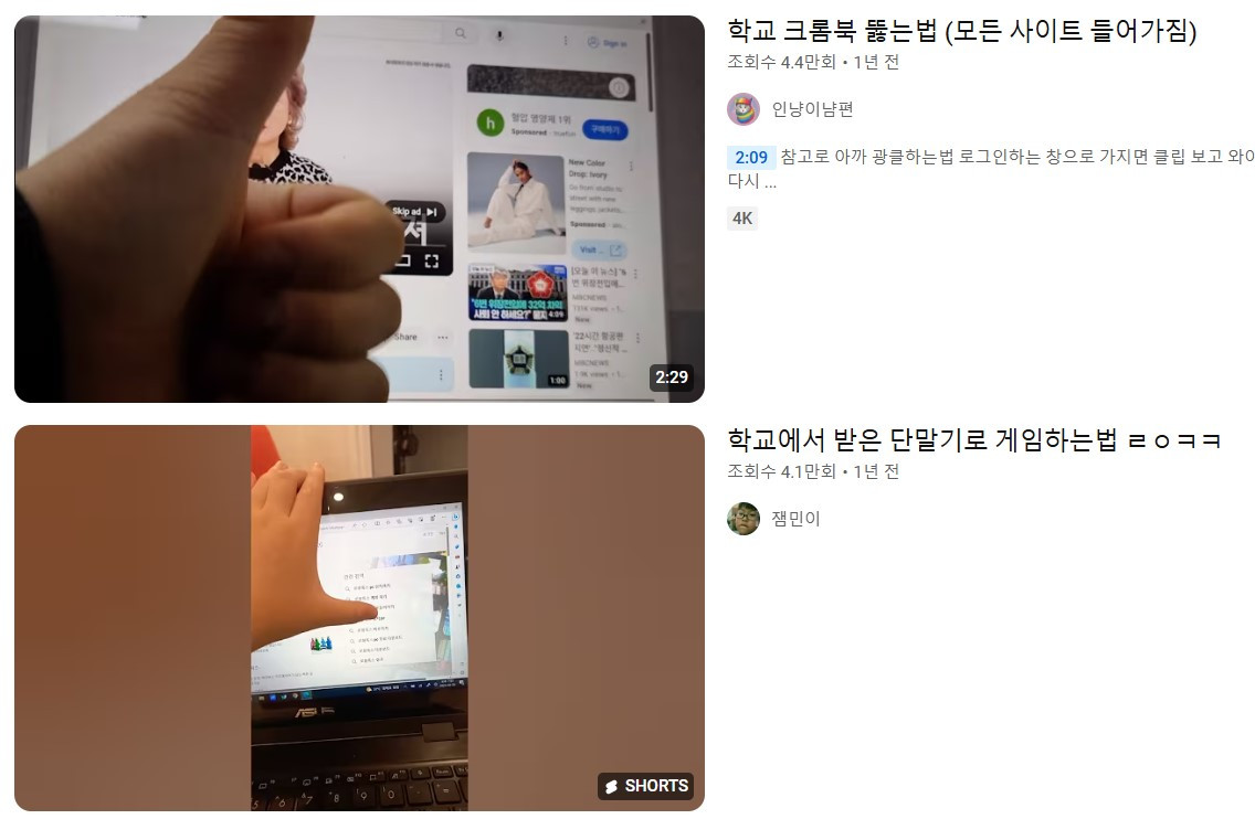 문제는 이 넷북을 용도 외로 사용하는 경우가 너무 잦다는 점입니다. 둥이들의 제보에 따르면 사용할 수 없게 막혀있는 유튜브나 게임을 신나게 씁니다. 더 놀라운 사실은 학생이라는 사실을 숨기고 랜덤채팅까지 해서 친구들 연락처를 알려주는 장난을 치는 경우까지 있었다고 하더군요. 게다가 점심시간에는 넷북을 쓰고 싶어서 밥도 안 먹으러 가는 친구들도 제법 된다고 합니다.