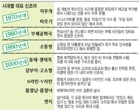20여 년 전 과거만 되돌아보더라도 우리 시대에는 신조어가 많았습니다. 지금 우리가 자주 쓰는 말 중에도 사실 과거엔 신조어였던 게 제법 많았죠. 아래에 나와있는 대표적인 사례처럼 지금은 당연하게 쓰이는 단어들이 모두 각 시대의 문화를 담아내며 정착해 왔습니다.