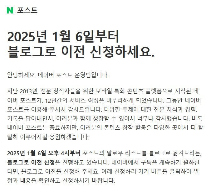 얼룩소뿐만이 아닙니다. 네이버에서는 지난달부터 네이버 포스트 서비스를 종료한다는 공지를 내고 사용자들에게 지속적으로 안내 메일을 보내왔습니다. 쉽게 이야기하면 블로그보다 진화된 전문 창작가들을 위한 공간을 만들어주겠다는 취지로 만든 플랫폼이 바로 네이버 포스트입니다.