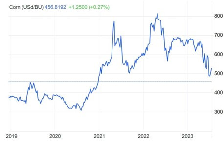 먼저 우리나라와 밀접한 관계가 있는 미국부터 알아보겠습니다. GDP가 세계 1위인 나라임에도 불구하고 식량난이 일어난 적이 있습니다. 대체 어떤 사연이었을까요? 현재 전 세계 인구의 30~40%가 옥수수를 주식으로 삼고 있습니다. 그만큼 옥수수의 활용도는 굉장히 높습니다. 사료나 바이오 연료로도 활용됩니다. 하지만 2023년 발생한 극심한 폭염과 가뭄으로 인해 미국의 주요 옥수수 생산지가 큰 피해를 입었습니다. 그로 인해 수확량이 크게 감소해 사료 및 식용 옥수수의 값이 그래프와 같이 매우 상승했습니다.