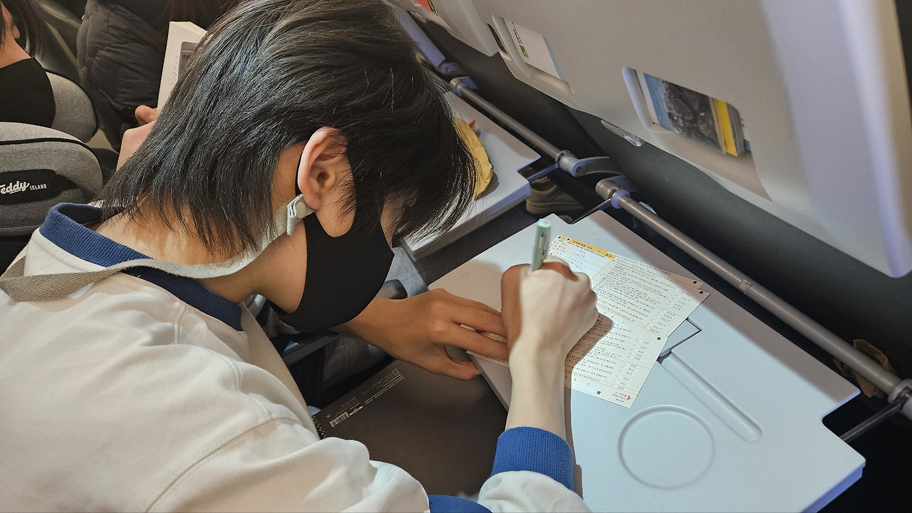 착륙을 얼마 남겨놓지 않고 입국자 1명당 입국신고서를 작성하는데 일단 제가 먼저 쓰고 행복이에게도 하나 써보라고 권해봅니다. 언젠가는 혼자 다닐 날도 있을 테니 연습 차원에서 말이죠. 절대 혼자 다 쓰기가 귀찮아서가 아닙니다! ^^