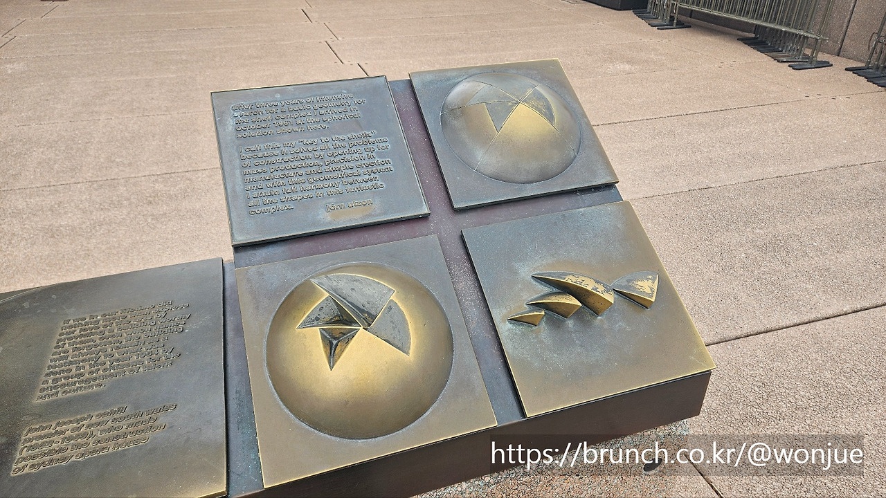 마지막 공식 일정은 오페라 하우스 내부 투어입니다. 입구에서 보니 이 건물이 어떻게 만들어졌는지 설명을 해놓은 청동 모형이 보입니다. 이런 단순한 모양이 전 세계 사람들에게 사랑을 받는 건물이 되었다니 놀랍습니다.