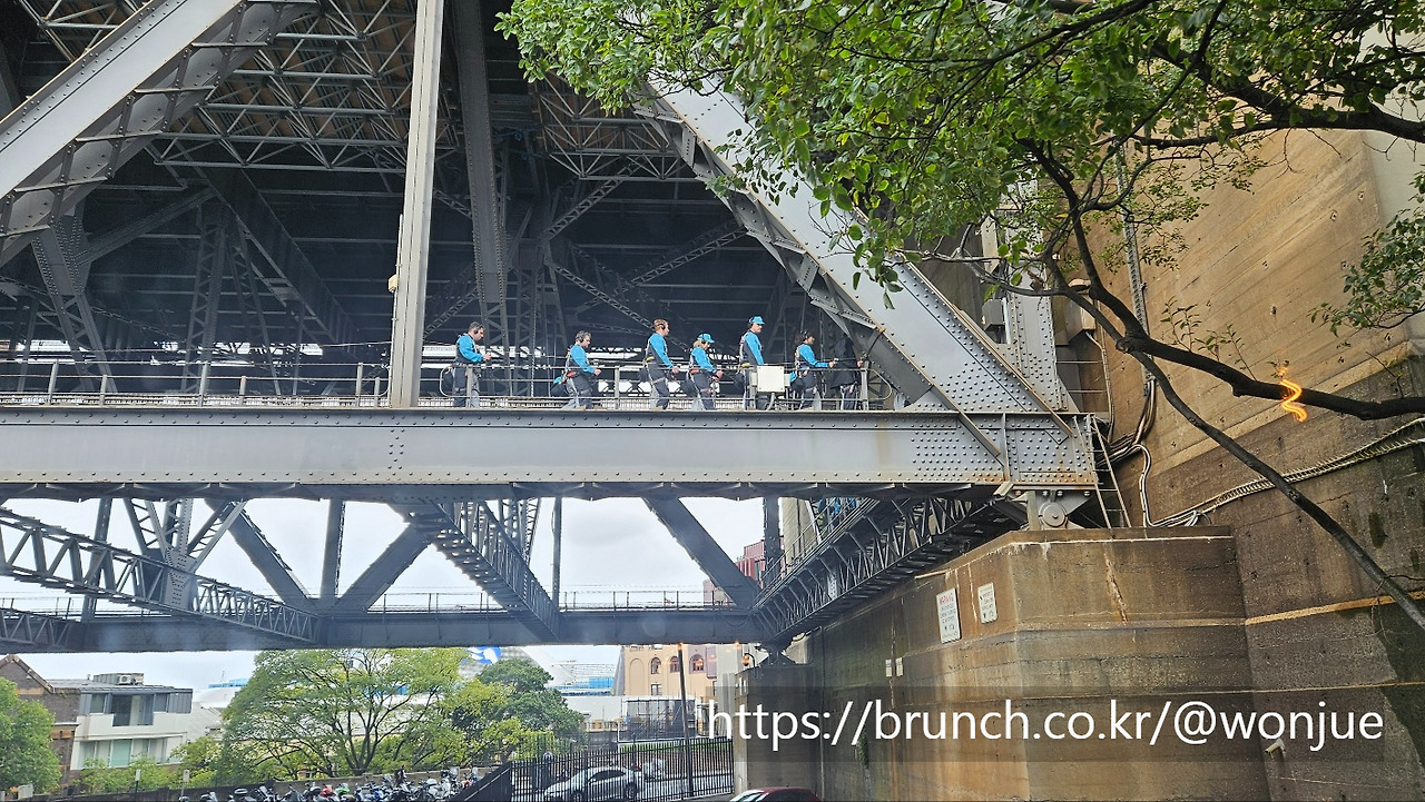 비바람이 몰아치는 날씨를 뚫고 패키지 투어팀은 하버브리지 트래킹을 했는데 그때 다리 위에서 찍은 사진입니다. 바라보는 위치가 달라지니 느낌이 새롭습니다 안 보였던 부분도 보이는 듯하고요.