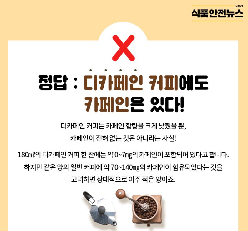 문제는 우리나라만 이 기준이 상당히 느슨하다는 점입니다. EU(99% 이상)나 미국(97% 이상)의 기준과 달리 카페인 제거를 90% 이상만 하면 디카페인(탈카페인)으로 표기할 수 있습니다. 게다가 브랜드별로 디카페인 제품의 카페인 함량이 다른데 이 정보를 소비자는 알 수 없는 상황이죠.